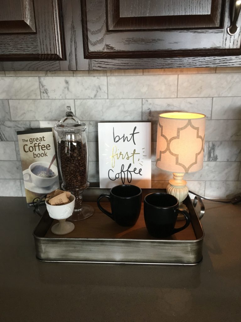 Aside from the obvious theme objects (a french press for a coffee-motif or a wine bottle for a vino corner etc.) play around with lighting, greenery, plants, trays, books and artwork! We have collected some of our favorite tiny lamps and little pieces of art over the years from stores and garage sales; not always knowing where we would use them, but liked the size, color and overall design. Lesson: don’t be afraid to build your vignette library, so that you are prepared when the opportunity comes. If you absolutely love certain items, you will use them and use them often. Many times, people are completely overwhelmed at the amount of ‘work’ involved in staging or re-designing; but this small and detailed sort of aesthetic requires very little capital and virtually zero manual labor (moving of furniture). Start with one little area at a time, and watch your kitchen, bathroom or bedroom take form.